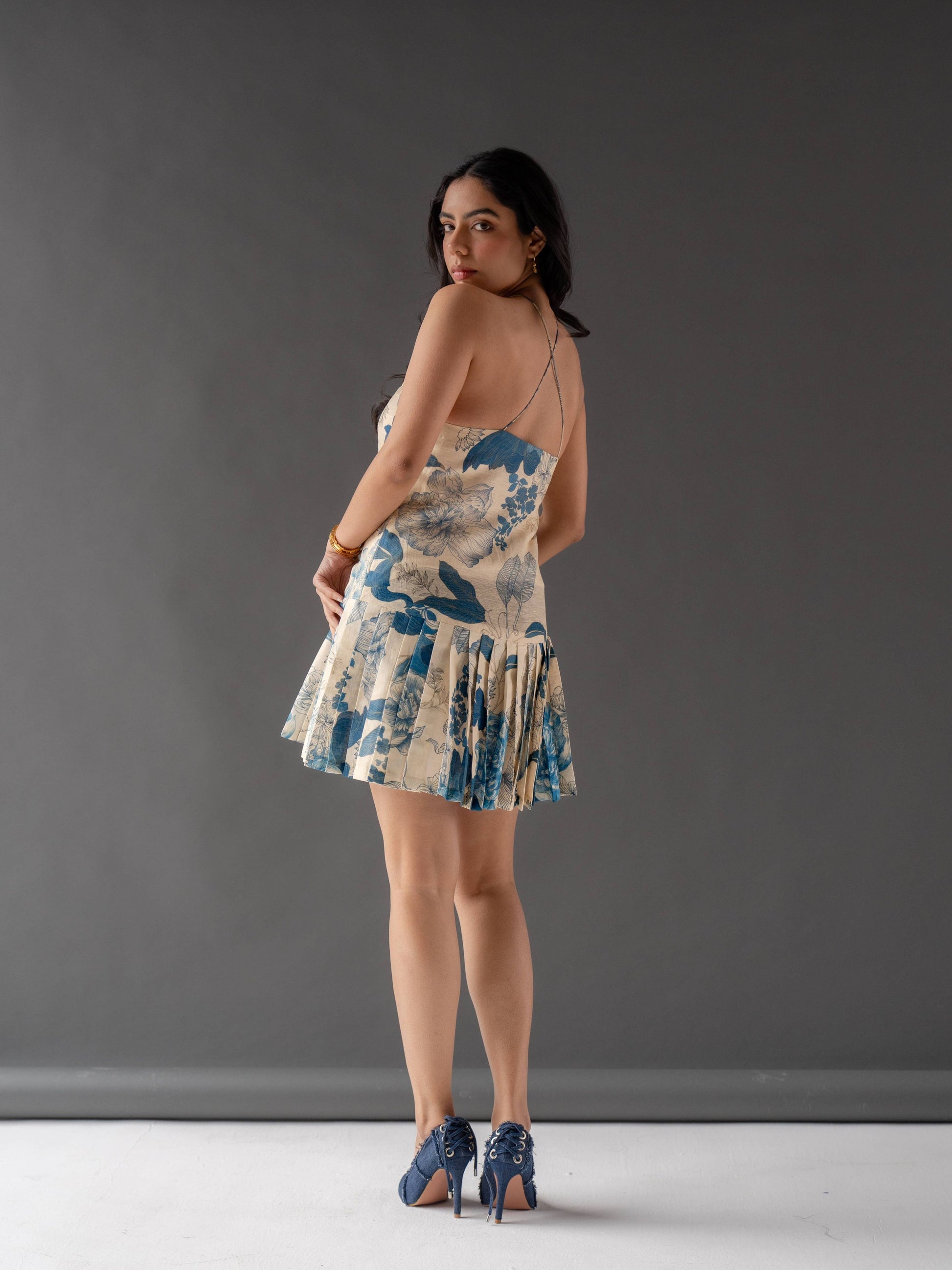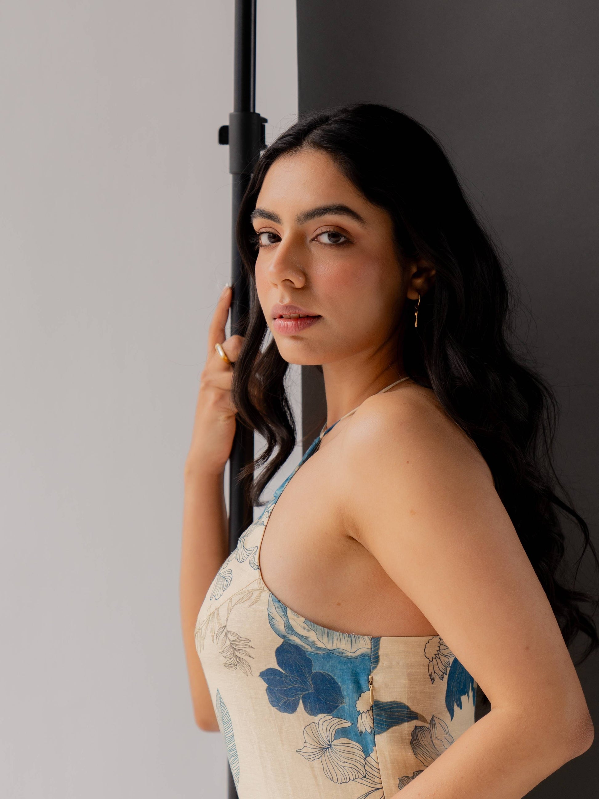 Design: A chic and feminine halter-neck mini dress featuring a delicate blue floral print on a soft beige base.